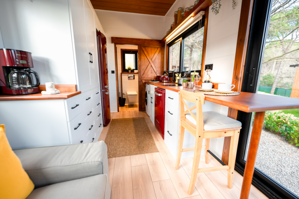 Zusätzlich zur Wohnfunktion eignen sich dieses Tiny House hervorragend als inspirierender Arbeitsplatz. Der Wohnraum lässt sich flexibel in ein Homeoffice verwandeln, das Ruhe und Produktivität fördert. Große Fenster sorgen für natürliches Licht, und die kompakte Größe minimiert Ablenkungen. So können Sie in Ihrem eigenen, maßgeschneiderten Büro kreativ arbeiten und Ihre beruflichen Ziele verfolgen.