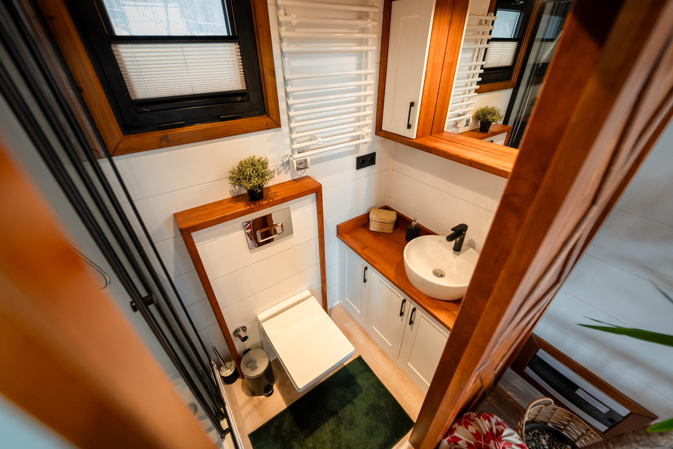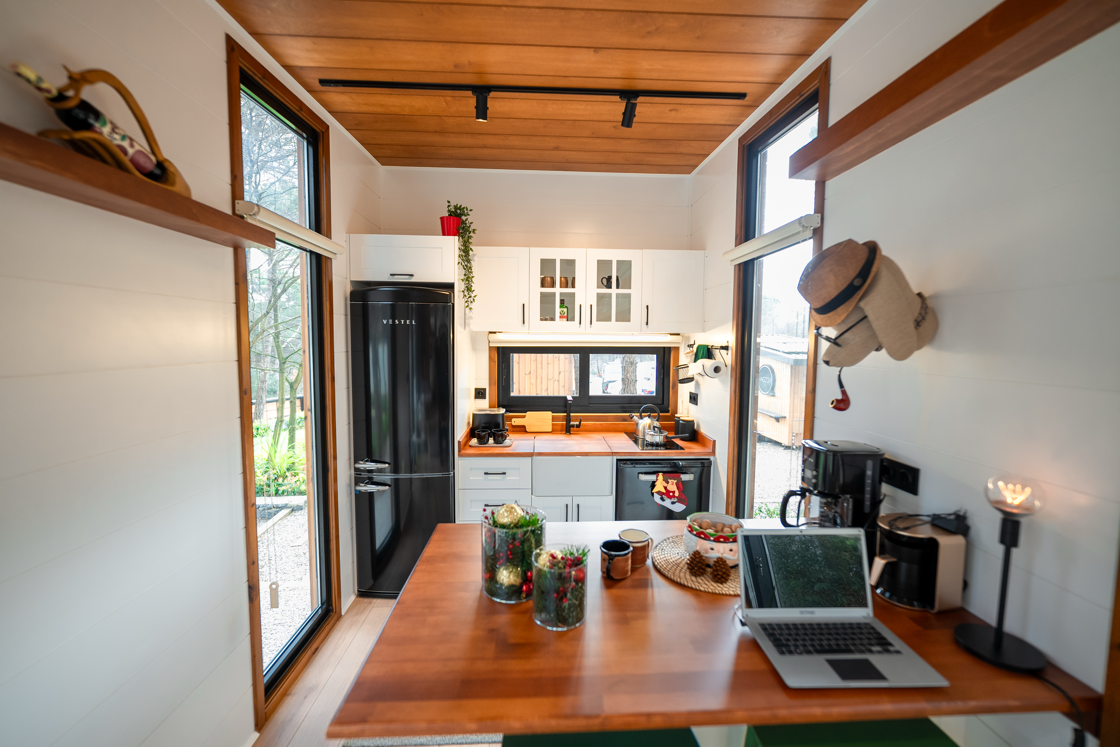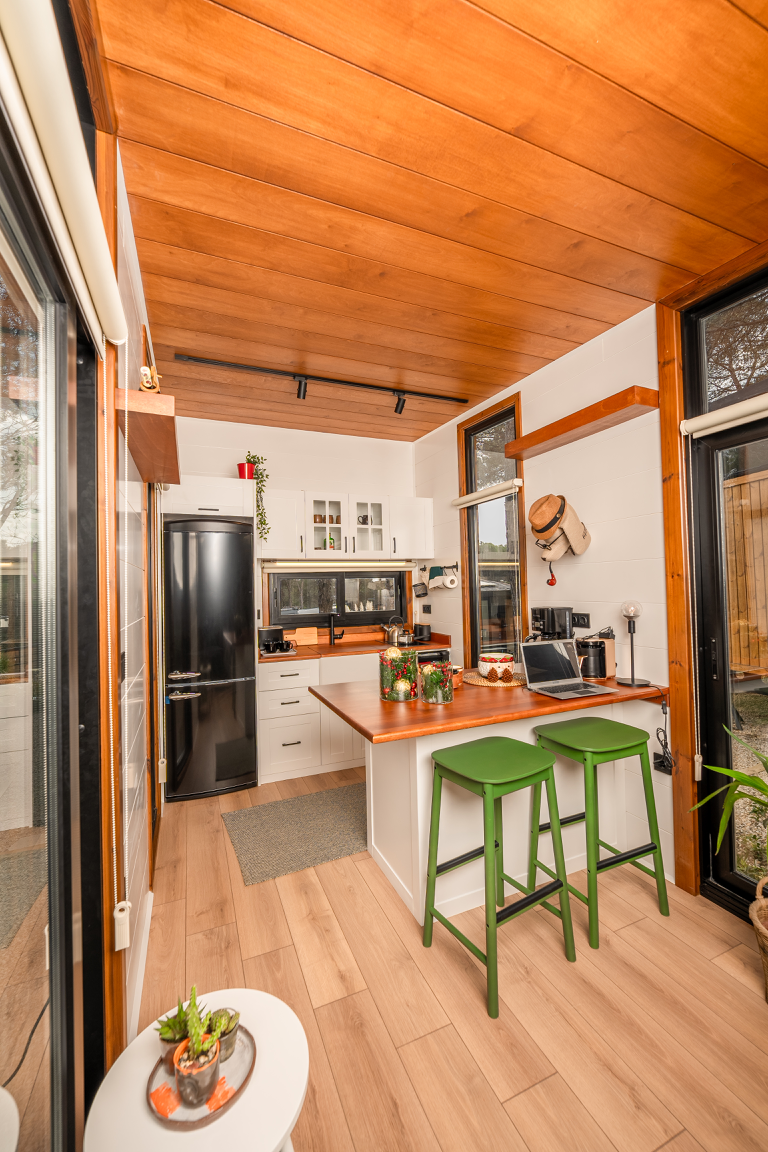 Dieses Tiny House definiert urbanen Lifestyle neu: Kompakt, aber keineswegs beengt, bietet es einen flexiblen Wohnraum, der sich nahtlos an Ihre Bedürfnisse anpasst. Die offene Gestaltung integriert eine moderne Küche und eine stilvolle Bar, perfekt für gesellige Abende oder das entspannte Feierabendbier. Das durchdachte Badezimmer komplettiert den Wohnkomfort und beweist, dass Luxus keine Frage der Größe ist.
